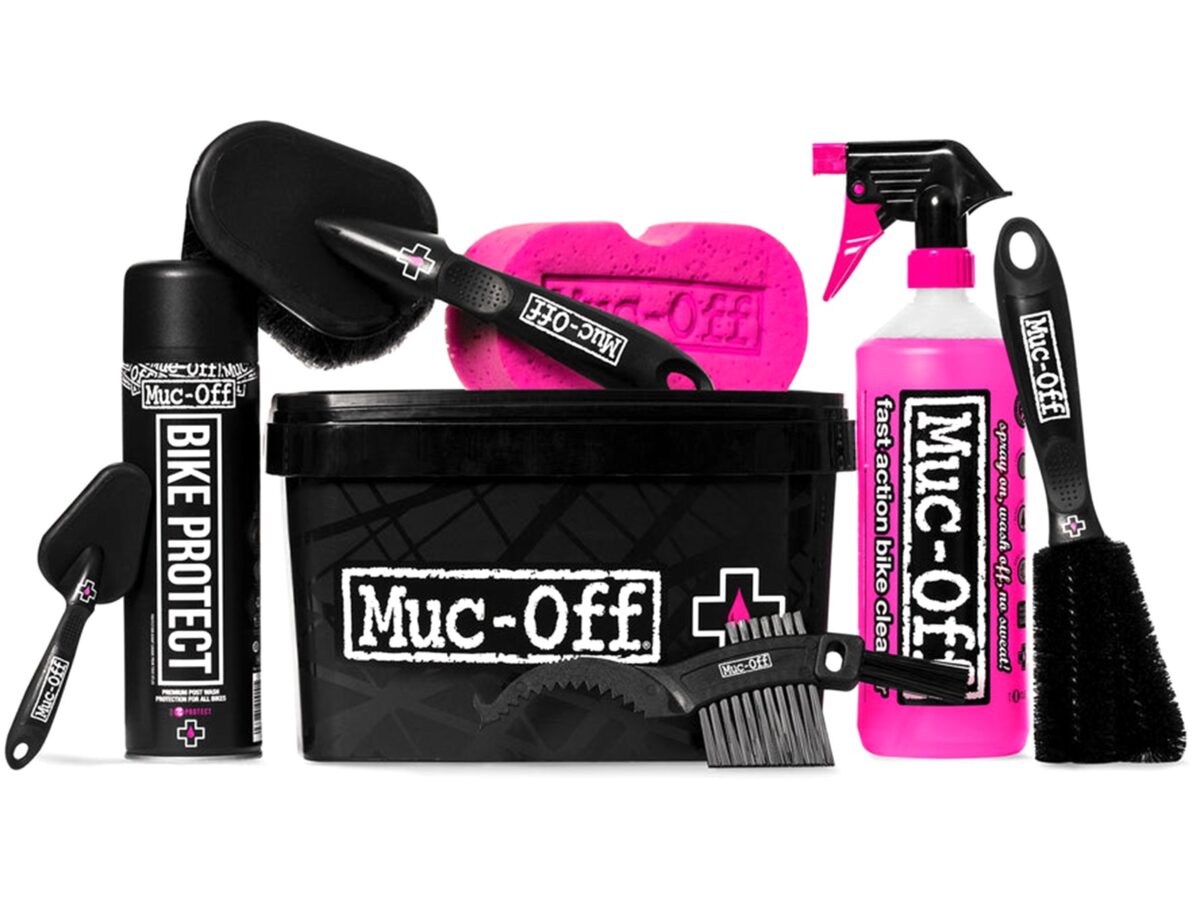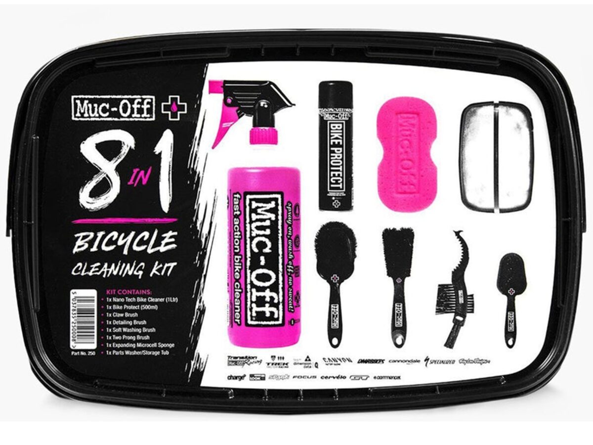 • Kit de nettoyage Muc-Off 8-en-1 Bicycle Cleaning Kit – Nano Tech + Bike Protect + 4 brosses + 1 éponge
